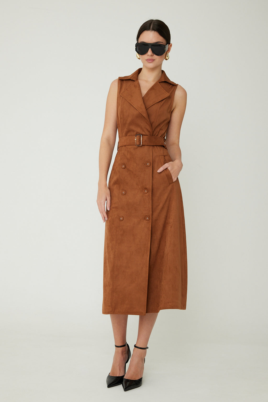 The Mae dress showcases an elegant trench silhouette. Style it cinched with the belt or open as a sleek long vest. Its deep cognac shade adds warmth and sophistication. Pair it with boots and layer over a cozy sweater for stylish, cooler autumn days. This dress offers exceptional versatility for your wardrobe.