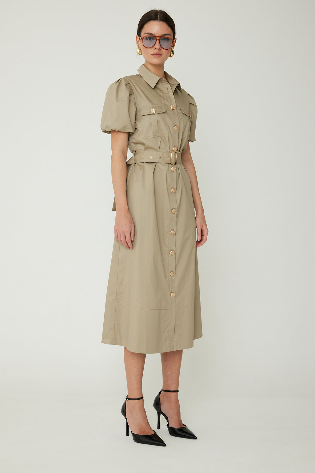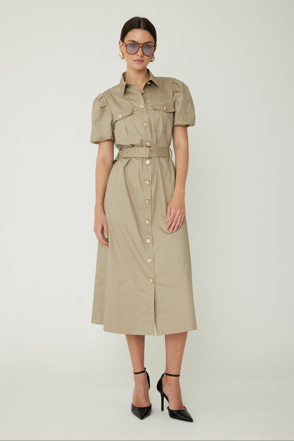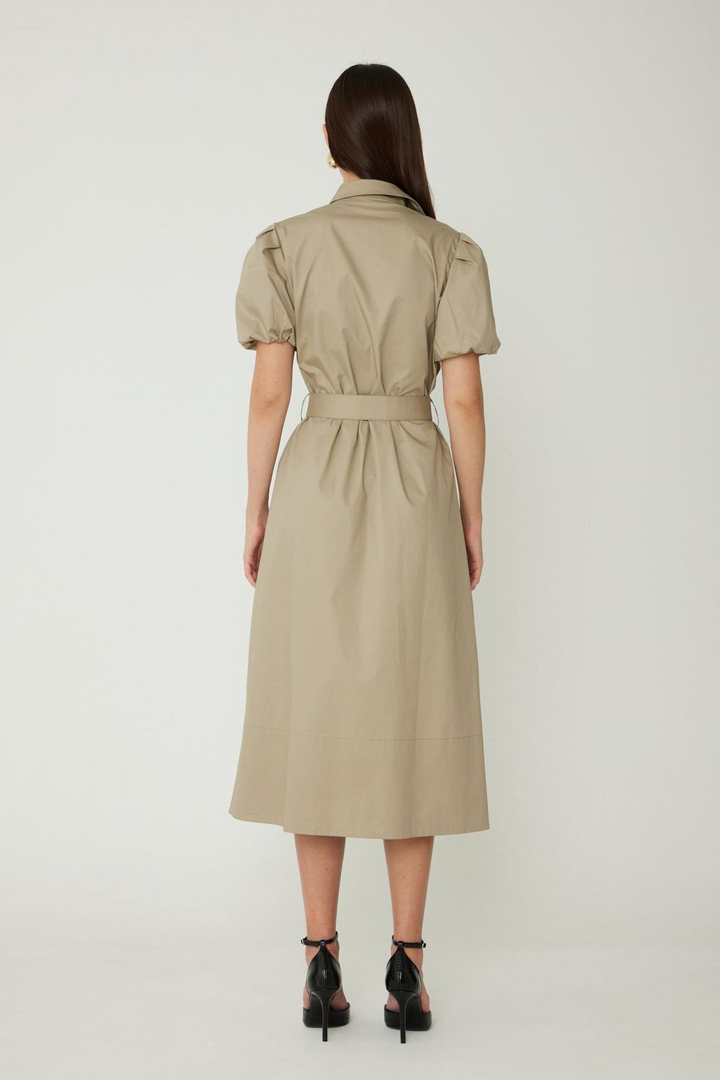 The Ruma dress offers a modern twist on the timeless shirt dress. Its taupe shade is perfect for autumn, while the gold hardware adds a refined military-inspired flair. Crafted from crisp cotton poplin, it combines elegance with comfort effortlessly.