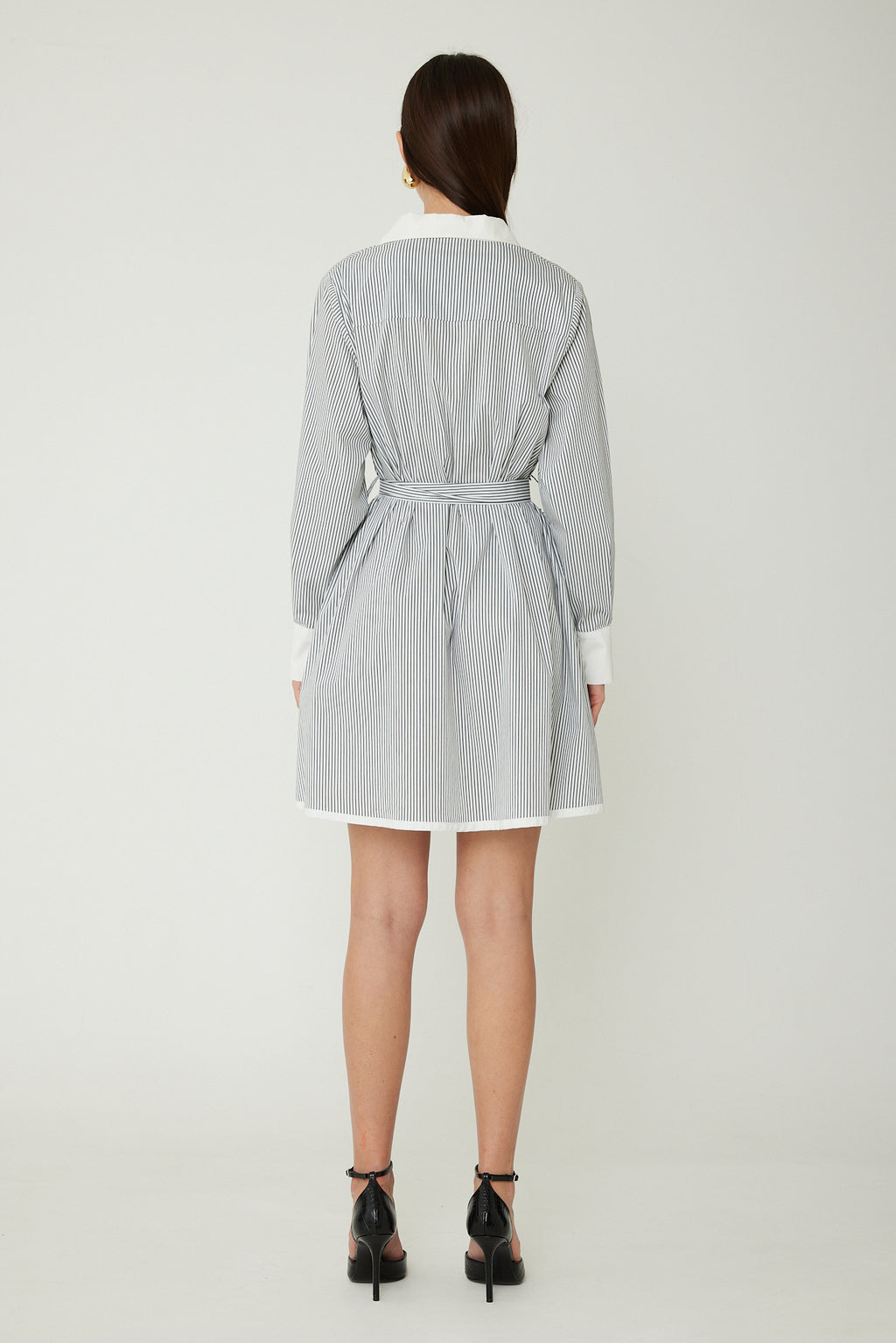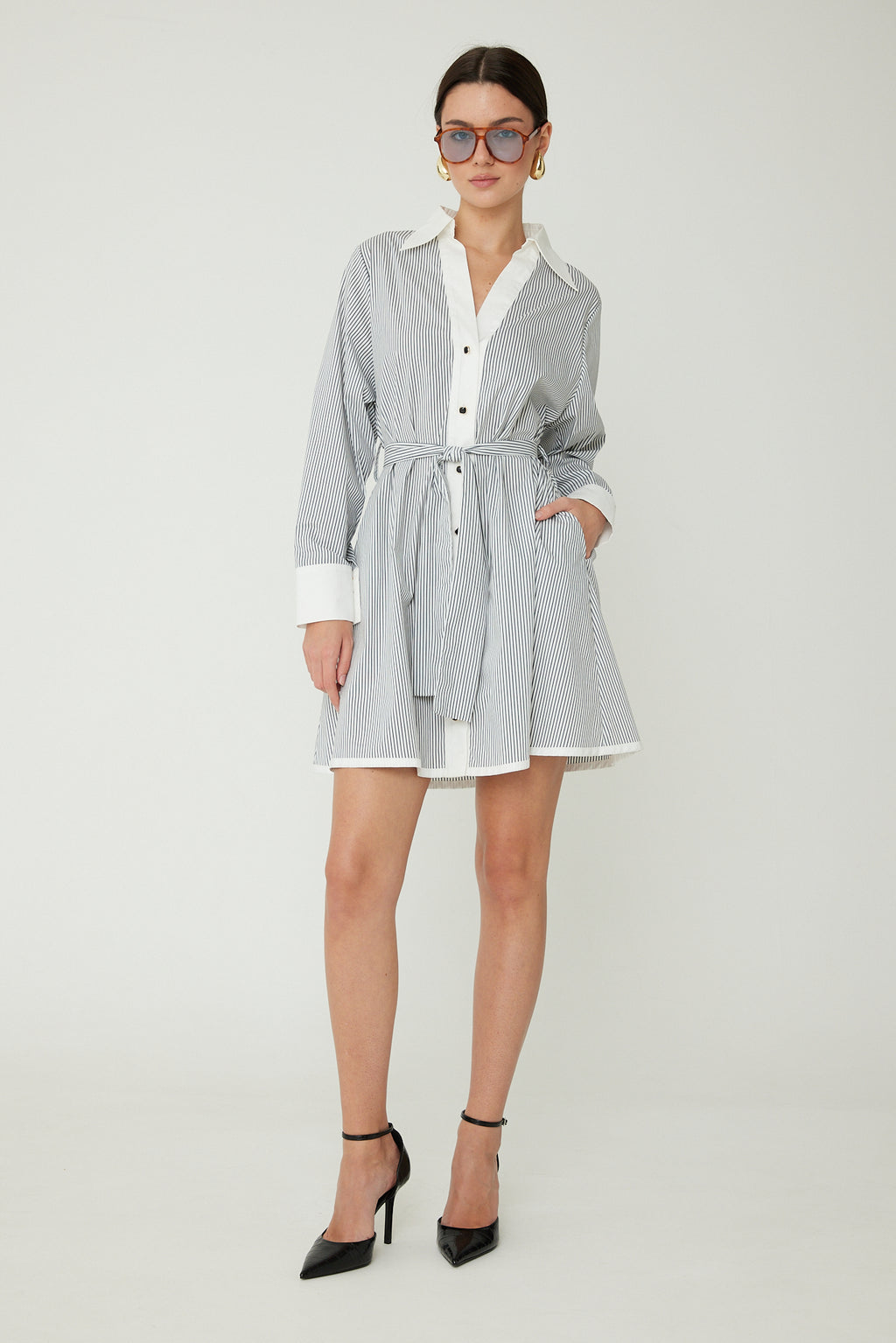 The Sabina shirt dress features timeless black and white stripes, enhanced by elegant black and gold buttons. Its refined design offers a sleek and polished appearance. Pair it with flats for an effortlessly chic, casual daytime outfit.
