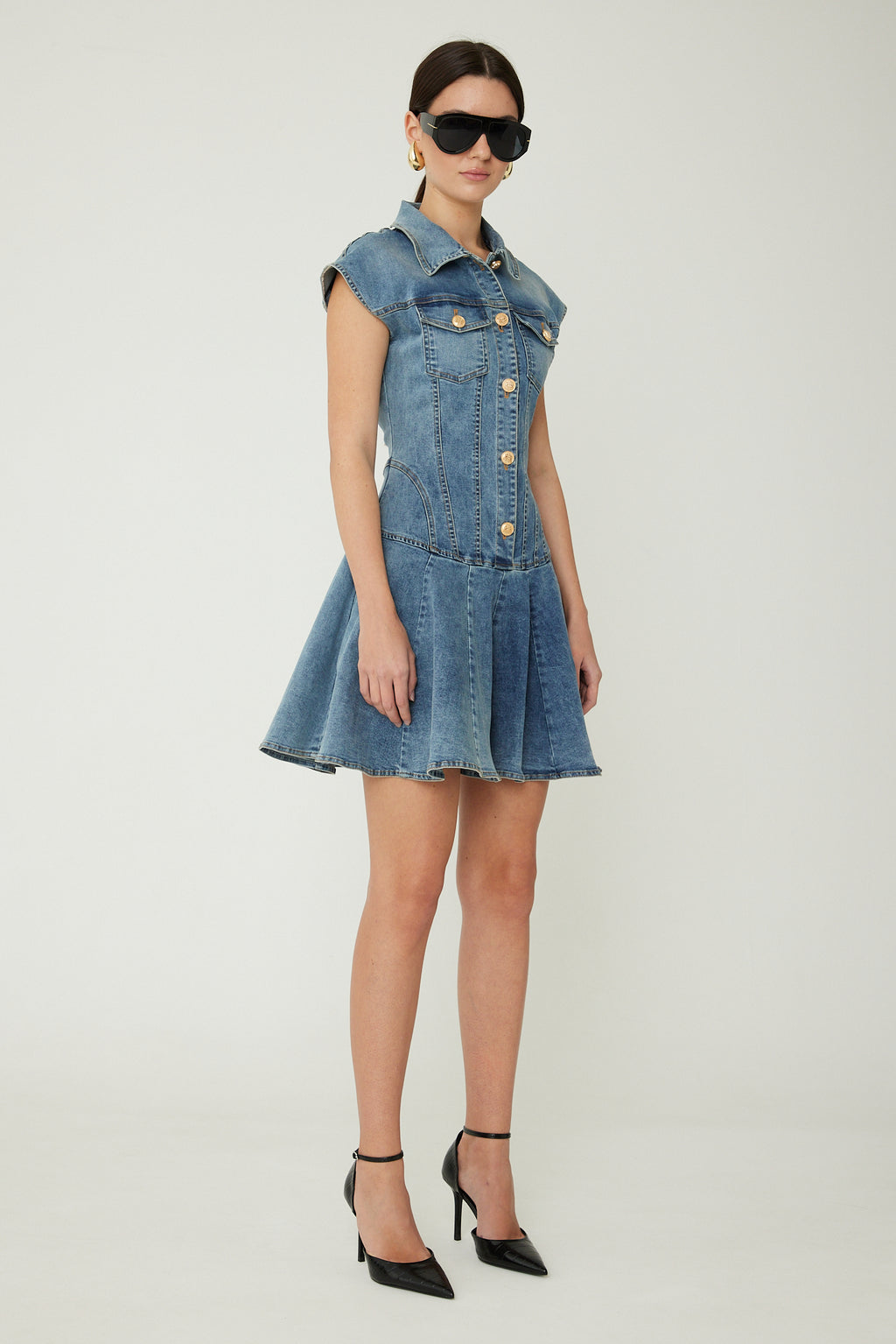 Crafted from our stretch denim in a medium wash, the Tina dress features elegant gold hardware accents. Its fit-and-flare silhouette enhances your shape beautifully. Versatile in style, it transitions effortlessly from casual to refined with just a change of footwear.