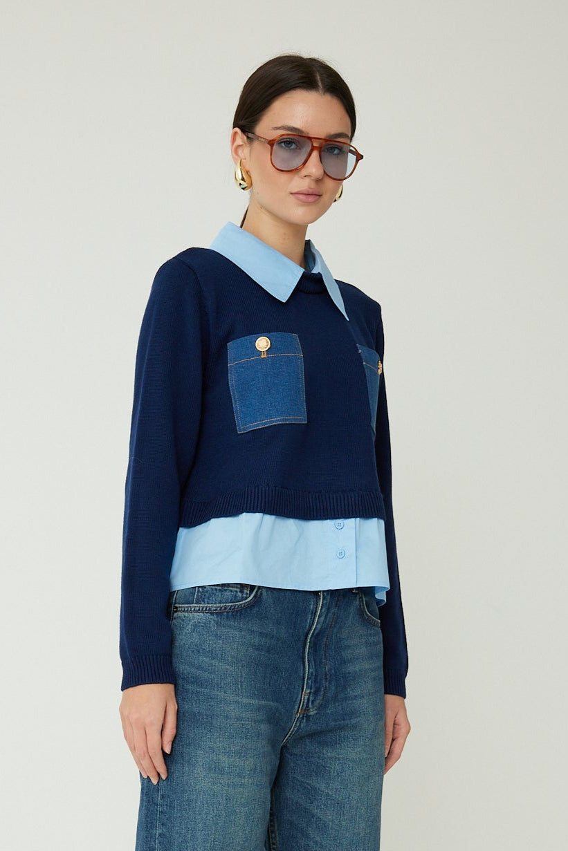 The Leila sweater features a timeless navy and light blue palette accented with gold hardware on the chest pockets. Its cropped silhouette elegantly reveals the cotton poplin shirt layered beneath, creating the illusion of a sweater worn over a shirt in a single-piece design. Perfectly blending sophistication and casual style, it pairs effortlessly with jeans for a refined yet relaxed look.